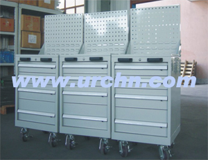 配 置:抽屉:2×100mm,2×150mm,1×200mm,每抽承重50kg,配2个定向轮,2个万向轮带刹车,配以600mm高方孔挂板